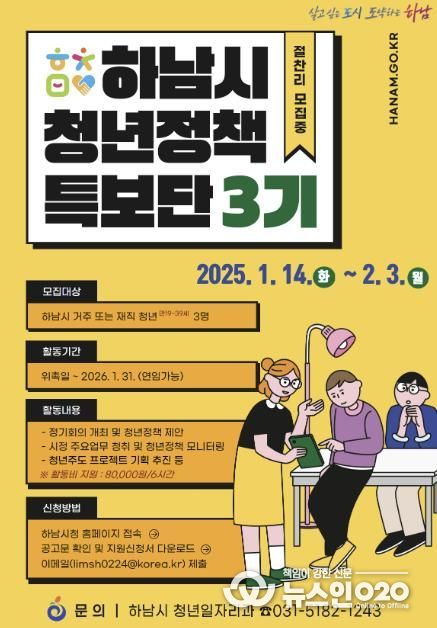 (뉴스인020 = 김성길 기자) 하남시는 시와 청년 간 가교 역할을 수행하는 ‘제3기 청년정책특보단’을 다음달 3일까지 모집한다고 14일 밝혔다.