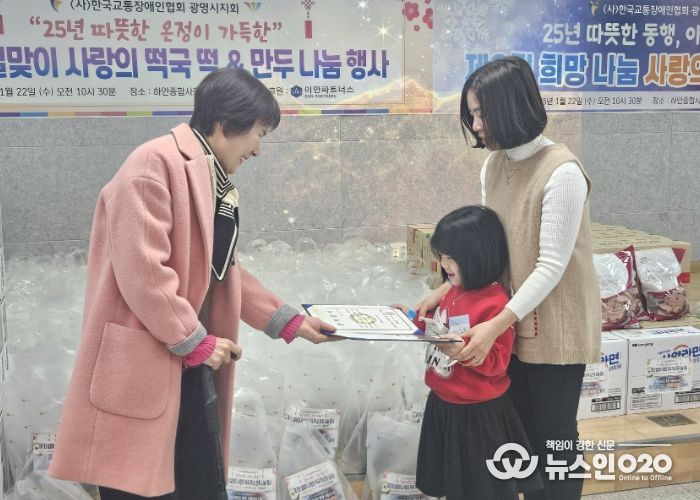 (뉴스인020 = 김성길 기자) 한국교통장애인협회 광명시지회는 22일 하안종합사회복지관 3층 대강당에서 ‘제7회 설맞이 사랑의 떡국떡·만두 나눔 행사’와 ‘제3회 희망나눔 사랑의 장학금 전달식’을 개최했다.