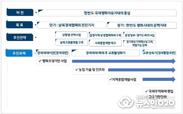 보고서는 경기도 평화경제협력 방향을 ▲점진적·단계적 추진 ▲지속성 확보 ▲남북 상호간 편익 발생 담보 ▲지역사회지지 기반 사업 추진 ▲북한사회·경제 성장 견인 ▲중앙정부와 지자체간 역할과 기능 분리로 설정하고 평화경제 추진전략을 여섯 가지로 설정했다. ▲남북관계 시나리오별 전략 수립 ▲추진체계 및 추진역량 강화 ▲접경지역 상생 협력체제 구축 ▲남북 사회통합 역량 제고 ▲경기북부 지역 특수성에 따른 역할과 기능 강화 ▲중앙정부와 경기도간 남북교류 파트너십 형성이 그것이다.