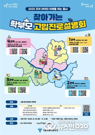 (뉴스인020 = 김성길 기자) 서울특별시교육청은 오는 9월 한 달간 서울 관내 중학교 학부모를 대상으로 자녀의 고등학교 선택과 진로 설계를 돕기 위해 권역별로 ‘2025 찾아가는 학부모 고입진로설명회’를 개최한다.