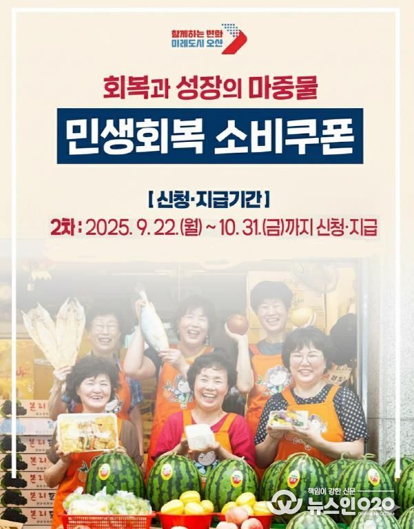 (뉴스인020 = 김성길 기자) 오산시는 오는 9월 22일부터 10월 31일까지 ‘2차 민생회복 소비쿠폰’을 지급한다고 밝혔다. 이번 2차 지급은 국민 90%를 대상으로 1인당 10만 원이 지원되며, 신청 첫 주(9월 22~26일)에는 출생연도 끝자리별 요일제가 적용된다.