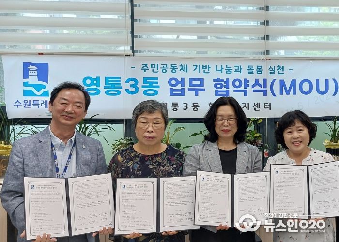 (뉴스인020 = 기자) 수원시 영통3동은 9월 16일, 영통3동 행정복지센터에서 ‘새빛복지중개사’ 민·관 협력사업 협약식을 열고, 위기가구를 발견하고 주거취약계층에게 주거서비스를 지원하기 위한 민·관 협력 체계를 구축했다.