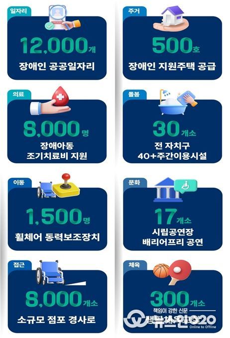 먼저 장애인 공공일자리를 현재 연간 5,000개 수준에서 2027년 7,000개, 2030년 1만 2,000개로 단계적으로 늘려 사회참여를 확대하고 이를 통해 스스로 미래를 설계할 수 있는 기회를 제공한다. 장애인 공공일자리는 공공기관·복지관 행정지원업무 등 ‘일반사무보조형’을 비롯해 요양보호사 보조‧어르신 안마서비스 등 ‘사회서비스형’, 바리스타·사서 등 ‘취업연계형’ 등이 있다.