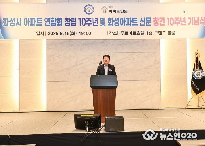 (뉴스인020 = 김성길 기자) 화성특례시의회는 16일, 푸르미르호텔 그랜드 볼룸홀에서 열린 ‘화성시아파트연합회 창단 10주년 및 화성아파트신문 창간 10주년 기념식’에 참석해 아파트 공동체 문화 발전과 건강한 주거 문화를 응원했다.