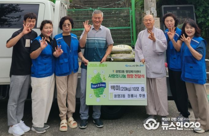 (뉴스인020 = 김성길 기자) 광명시 광명3동 대한불교조계종 청룡사는 지난 24일 추석을 맞아 백미 20kg 10포를 광명3동 지역사회보장협의체에 기탁했다.