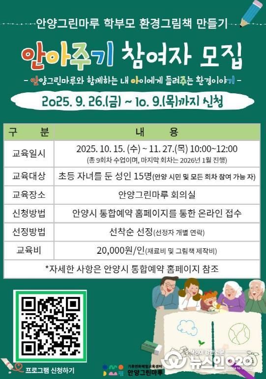 (뉴스인020 = 김성길 기자) 안양시가 기후변화체험교육센터 안양그린마루에서 오는 10월부터 11월까지 8회에 걸쳐 학부모를 대상으로 한 교육프로그램 ‘안아주기(안양그린마루와 함께하는 내 아이에게 들려주는 환경이야기)’를 운영한다고 29일 밝혔다.