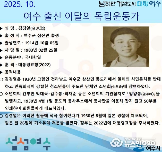 (뉴스인020 = 김성길 기자) 여수시는 2025년 10월의 독립운동가로 전라남도 여수군 삼산면 출신의 ‘김경열(金京烈)’ 선생을 선정했다.