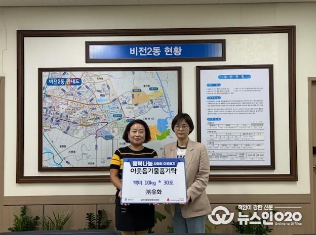 (뉴스인020 = 김성길 기자) ㈜유화는 추석 명절을 맞아 지난 29일 비전2동 행정복지센터를 방문하여 100만원 상당의 백미 30포를 전달하며 온정을 베풀었다.