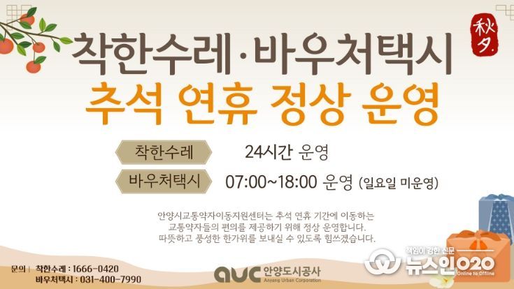 (뉴스인020 = 김성길 기자) 안양시가 오는 추석 연휴 기간(10.3.~10.9.)에 교통약자의 이동권 보장을 위한 특별교통수단 이동지원서비스 ‘착한수레’와 ‘바우처택시’를 정상 운행한다고 1일 밝혔다.