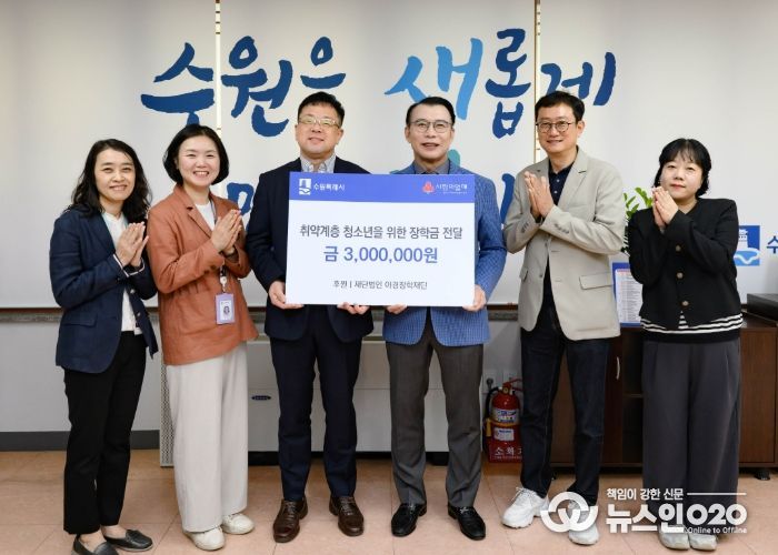(뉴스인020 = 기자) 아경장학재단이 “취약계층 중·고등학생에게 전달해 달라”며 수원특례시에 300만 원을 기탁했다.