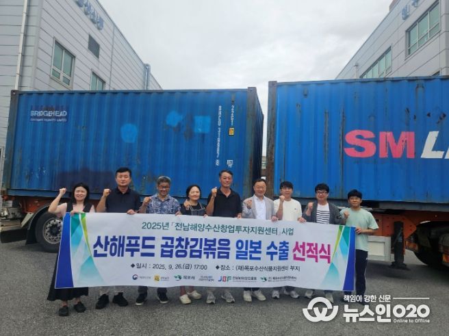 (뉴스인020 = 김성길 기자) (재)목포수산식품지원센터는 9월 26일, 전남해양수산창업투자지원센터 사업 수혜기업인 산해푸드(대표 오시윤)가 일본 바이어와 체결한 2만3천 달러(한화 약 3천2백만 원) 규모의 곱창김 제품 수출 계약에 따라 센터에서 선적식을 개최했다고 밝혔다.