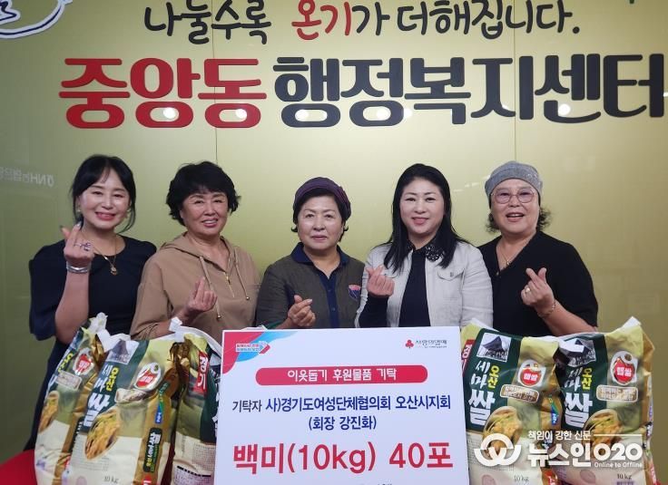 (뉴스인020 = 김성길 기자) 사단법인 경기도여성단체협의회 오산시지회는 지난 10월 1일, 추석 명절을 앞두고 지역 내 어려운 이웃을 위해 백미(10kg) 5포씩을 오산시 관내 8개 동 행정복지센터에 각각 기탁했다.