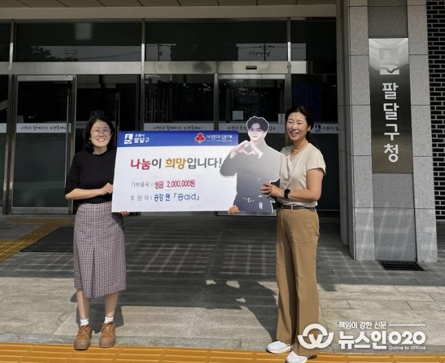 (뉴스인020 = 기자) 배우 송강 팬모임 ‘송aid’가 지난 1일 수원시 팔달구 출신 배우 송강의 군복무 전역을 기념하여 팔달구 내 저소득층 아동·청소년 가구에 장학금 명목의 성금 200만원을 기부했다.