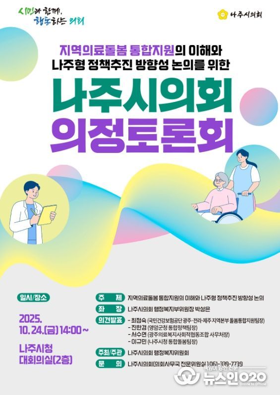 (뉴스인020 = 김성길 기자) 나주시의회은 오는 24일 금요일 14시, 나주시청 2층 대회의실에서 2025년 제1회 나주시의회 의정토론회를 개최한다고 14일 밝혔다.