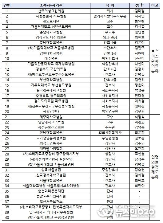 호스피스·완화의료 분야에서는 호스피스·완화의료 연구 발전에 이바지한 가천대 길병원 황인철 교수, 가톨릭대학교 서울성모병원 김진주 간호사, 천주교부산교구부산성모병원 정미경 자원봉사자 등 총 20명에 대해서 장관 표창을 수여했다.