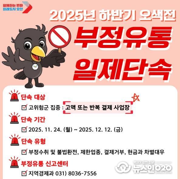 (뉴스인020 = 김성길 기자) 오산시는 지역화폐 ‘오색전’의 건전한 유통 질서 확립과 지역경제 보호를 위해 2025년 11월 24일부터 12월 12일까지 부정유통 행위 집중 단속을 실시한다고 밝혔다.