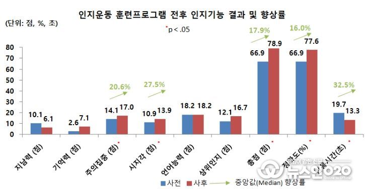 인지운동 훈련프로그램의 효과성 분석 결과, 참여 노인의 전체 인지기능 점수 중앙값은 17.9% 향상됐으며, 주의집중(20.6%), 시지각(27.5%), 정확도(16.0%), 반응시간(32.5%) 등 주요 인지 영역에서 통계적으로 유의미한 개선이 확인됐다. 또한 기억력 개선에서도 긍정적인 변화가 나타났다.