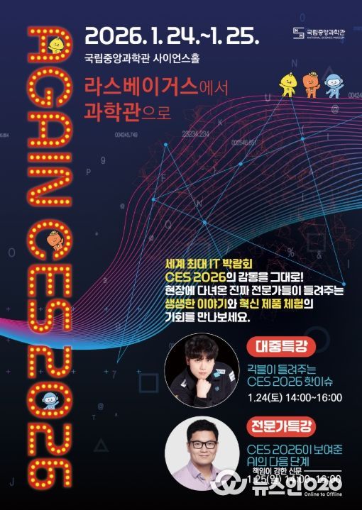 (뉴스인020 = 김나현 기자) 미래의 꿈을 만드는 과학기술 문화 이음터(플랫폼) 과학기술정보통신부 국립중앙과학관은 1월 24일부터 1월 25일까지 이틀간 국립중앙과학관 사이언스 홀에서 세계 최대 정보 기술(IT) 박람회인 2026 미국 가전 전시회(CES 2026)를 되짚어 보는 행사를 개최한다.