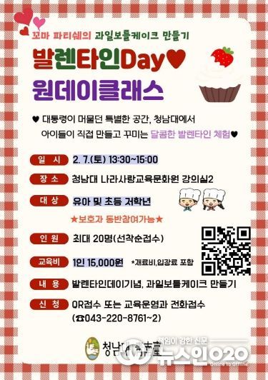 (뉴스인020 = 김성길 기자) 충청북도 청남대관리사업소는 다가오는 발렌타인데이를 맞아 어린이와 가족들이 함께 즐길 수 있는 특별한 체험의 장을 마련한다.