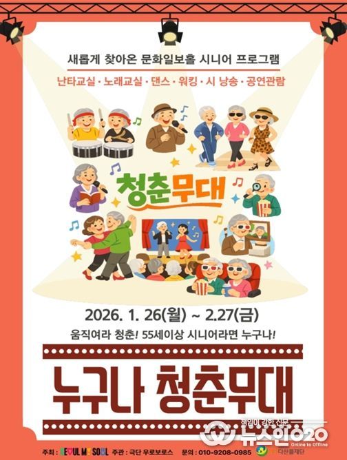 김태희 서울시 문화본부장은 “‘누구나 청춘무대’의 시범 운영은 겨울철 어르신 쉼터 기능을 수행하는 동시에, 3월 본격 운영을 위한 프로그램 구성과 운영 방식을 사전 검증하는 단계”라며 “시범 운영을 거쳐 여가와 문화 향유 기회가 부족한 어르신들이 편안하고 즐겁게 머물 수 있는 따뜻한 문화공간으로 키워가겠다”라고 말했다.