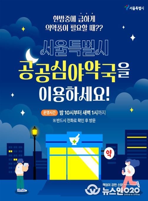 서울시는 늦은 밤 갑작스러운 증상으로 어려움을 겪는 시민을 위해 밤 10시부터 다음 날 새벽 1시까지 운영하는 공공심야약국을 25개 자치구, 총 39개소를 운영하고 있다. 이 중 365일 운영되는 약국은 28곳, 요일별로 운영되는 약국은 11곳이다. 요일별 운영은 월‧수‧금 등 특정 요일을 지정해서 운영하는 방식이다.