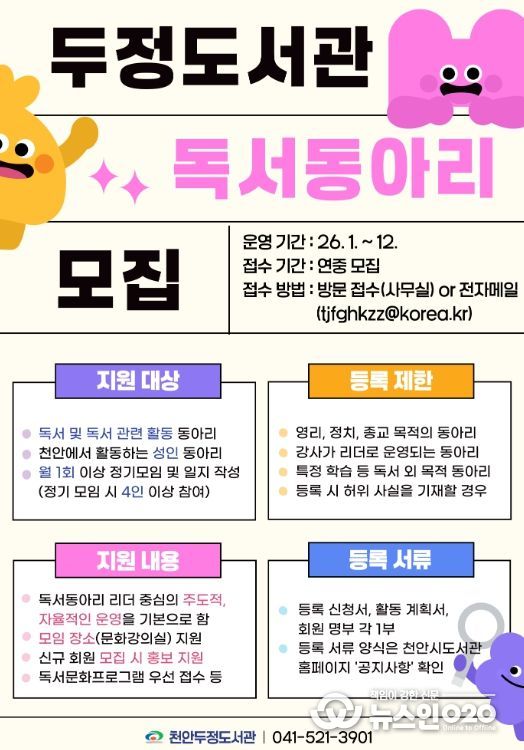 (뉴스인020 = 김성길 기자) 천안시 두정도서관은 책 읽는 공동체 형성을 위해 독서동아리를 모집한다고 30일 밝혔다.