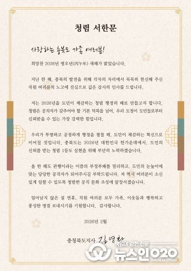 (뉴스인020 = 김성길 기자) 김영환 충북도지사가 2026년 병오년(丙午年)을 ‘도민이 체감하는 청렴 행정의 해’로 만들겠다는 의지를 담은 청렴서한문을 전 직원에게 발송하고, 올 한 해 청렴 실천을 당부했다.