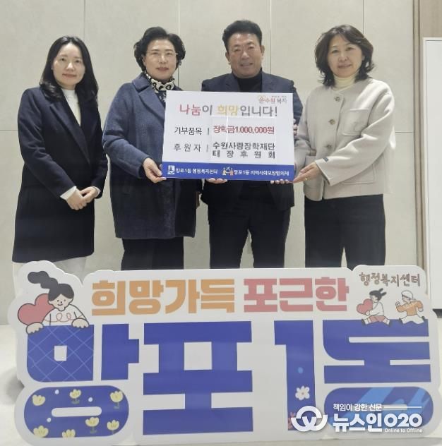 (뉴스인020 = 김성길 기자) 수원시 영통구 망포1동은 지난 4일, 수원사랑장학재단 태장후원회에서 민족 고유 명절 설을 맞아 지역인재 육성과 이웃사랑 실천을 위해 장학금 100만원을 기탁했다고 밝혔다.