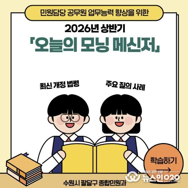 김미라 팔달구 종합민원과장은 “매일 아침 짧은 시간을 투자한 꾸준한 직무 학습이 시민들에게 더욱 정확하고 친절한 행정서비스를 제공하는 밑거름이 될 것”이라며, “앞으로도 직원들의 민원 대응 역량을 강화해 시민이 체감할 수 있는 만족도 높은 구정을 펼쳐 나가겠다”라고 전했다.