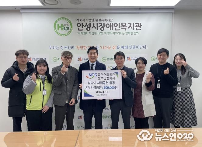 (뉴스인020 = 김성길 기자) 사회복지법인 한길복지재단에서 수탁하고 있는 안성시장애인복지관은 지난 2월 11일 국민연금공단 평택안성지사로부터 설 명절을 맞아 온누리상품권 60만원을 기탁받았다고 밝혔다.