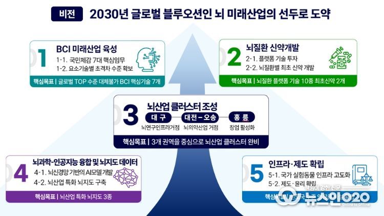 세계적 수준으로 성장한 국내 대표 뇌 연구기관을 거점으로 지역의 뇌 산업 산학협력 지구(클러스터) 성장을 지원한다. 한국뇌연구원이 소재한 대구 권역은 국내 뇌 연구 기반 시설(인프라)을 집적하고, 오송-대전 권역에는 한국생명공학연구원, 한국과학기술원(KAIST) 등 대전의 정부 출연연과 오송 생명 공학(바이오) 산업 산학협력 지구(클러스터) 간 개방형 가치 사슬(밸류채인)을 구축한다.