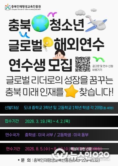 (뉴스인020 = 김성길 기자) 충북인재평생교육진흥원은 도내 중·고생 총 40명을 대상으로 ‘2026년 충북 청소년 글로벌 해외연수’에 함께할 연수생을 모집한다.
