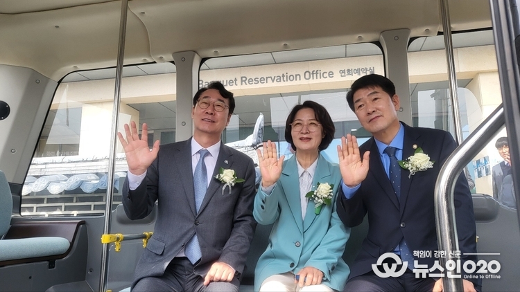 ▲ 자율주행차 승차하여 포즈를 하고 있는 ▲정명근 시장, ▲추미애 전 국회 법제사법위원장, ▲배정수 화성시의회 의장,