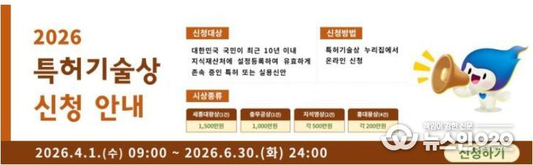(뉴스인020 = 김나현 기자) 지식재산처는 4월 1일부터 6월30일까지 「2026년 특허기술상」 신청 접수에 들어간다고 밝혔다. 「특허기술상」은 발명자의 의욕 고취 및 국민적 발명 분위기 확산을 위해 우수 기술을 발굴·선정하여 발명자에게 시상하는 제도이다.