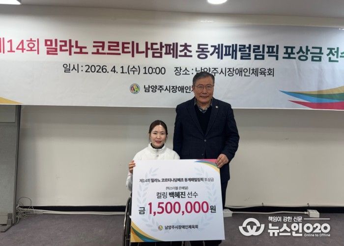 (뉴스인020 = 김성길 기자) 남양주시는 지난 1일 남양주시장애인체육회가 제14회 밀라노-코르티나담페초 동계패럴림픽 휠체어컬링 믹스더블 종목 은메달리스트 백혜진 선수에게 포상금을 전달하고 성과를 격려했다고 2일 밝혔다.