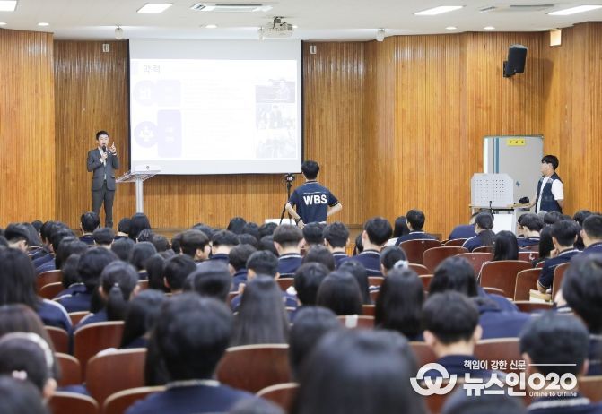 (뉴스인020 = 김성길 기자) 안산시의회 송바우나 의장이 10일 원곡고등학교에서 초청 진로 특강의 강사로 나서서 원곡고 학생 270여명을 대상으로 ‘의회와 시의원의 역할’을 주제로 강연을 실시했다.