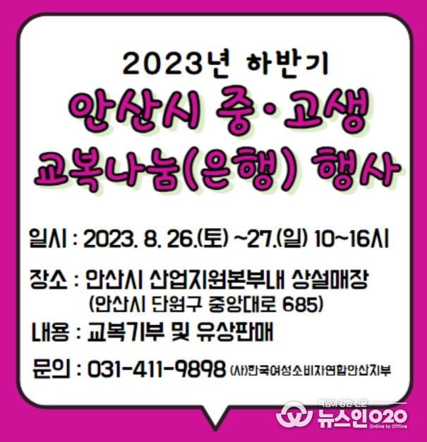 (뉴스인020 = 김성길 기자) 안산시는 오는 26일부터 27일까지 이틀간 산업지원본부 내 교복 상설매장(단원구 중앙대로 685)에서 ‘중·고생 교복 나눔 행사’를 개최한다고 25일 밝혔다.
