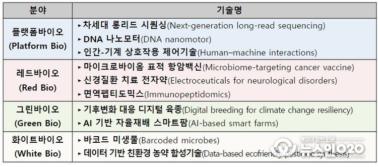 올해 선정된 10대 기술에는 ▴차세대 롱리드 시퀀싱(플랫폼바이오), ▴마이크로바이옴 표적 항암백신(레드바이오), ▴기후변화 대응 디지털 육종(그린바이오), ▴바코드 미생물(화이트바이오) 등이 포함됐다.