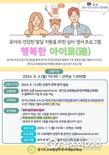 경기도교육청남부유아체험교육원(원장 허인영)은 도내 공사립유치원 소속 5세(2018년생) 유아 1,000여 명을 대상으로 온라인 유아 심리․정서 검사 지원 프로그램을 운영한다고 밝혔다.