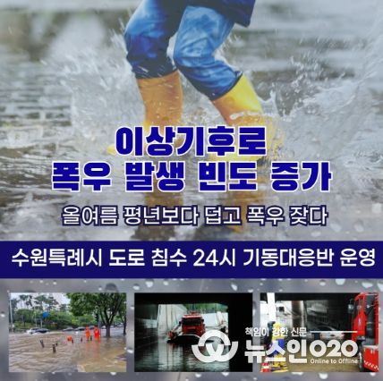 (뉴스인020 = 박용우 기자) 수원시(시장 이재준)가 9월 30일까지 ‘도로침수 24시 기동대응반’을 운영해 예측 불가능한 폭우에 대비한다.