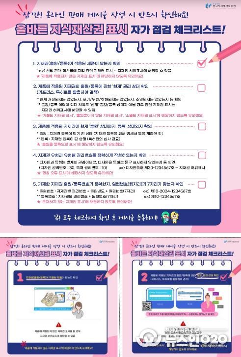 ‘자가 점검 점검표(체크리스트)’는 상품 판매자가 판매 게시글 등록 시 ▲ 지식재산권이 적용된 제품이 맞는지 ▲ 지식재산권의 현재 권리상태가 어떠한지(거절, 포기, 소멸 상태가 아닌지) ▲ 지식재산권이 현재 출원 상태인지 혹은 등록 상태인지 ▲ 지식재산권 유형과 권리번호를 정확하게 작성했는지 ▲ 출원·등록번호를 올바르게 기재했는지 여부를 스스로 점검할 수 있도록 제작됐다.