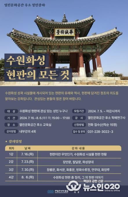 (뉴스인020 = 박용우 기자) 수원화성박물관 열린문화공간 후소에서 7월 16일부터 수원화성 시설물 현판을 주제로 한 성인 강좌 ‘수원화성 현판의 모든 것’이 열린다.