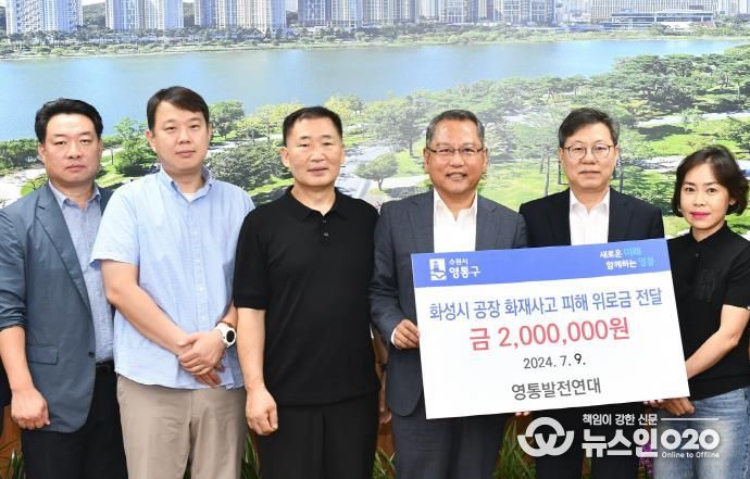 (뉴스인020 = 박용우 기자) 수원시 영통구 영통발전연대는 지난 6월 화성시 서신면 ‘아리셀공장’에서 발생한 화재로 인해 안타깝게 희생된 근로자들의 유족을 위로하고 지원하기 위해 2백만 원의 성금을 기부했다.