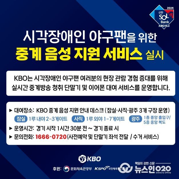 (뉴스인020 = 김민석 기자) KBO는 지난해에 이어 오는 7월 12일(금)부터 잠실, 사직, 광주 3개 구장에서 KBO 리그 시각장애인 현장 관람객 대상 중계 음성 지원 서비스를 실시한다.