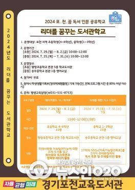 (뉴스인020 = 박용우 기자) 경기포천교육도서관이 오는 25일부터 포천 관내 초․중등 학생 대상으로 공유학교 ‘리더를 꿈꾸는 도서관학교’를 운영한다.