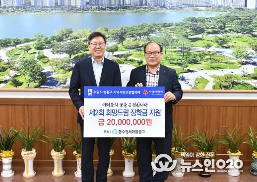 (뉴스인020 = 박용우 기자) 수원시 영통구는 지난 12일 동수원새마을금고에서 관내 초‧중‧고등학생 56명을 위한“제2회 희망드림 장학금” 2,000만 원을 영통구에 기탁했다고 밝혔다.