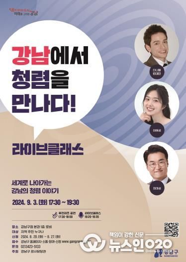 (뉴스인020 = 박용우 기자) 꿈이 모이는 도시, 미래를 그리는 강남구가 9월 3일 저녁 6시 구청 1층 로비에서 최태성, 다니엘, 이혜성과 함께하는 ‘강남에서 청렴을 만나다’ 라이브클래스를 개최한다.