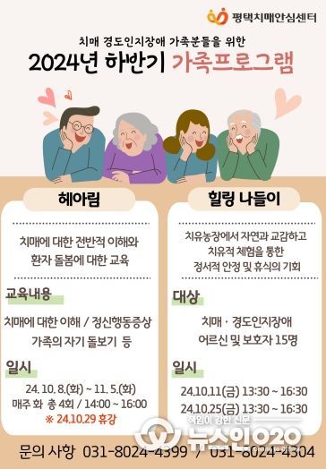 (뉴스인020 = 김성길 기자) 평택시는 치매 환자 가족 교실 프로그램인 ‘헤아림 2기’에 참여할 치매 또는 경도인지장애 진단을 받은 환자의 가족 및 보호자 10명을 모집한다고 밝혔다.