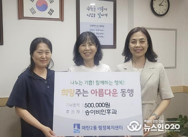 (뉴스인020 = 박용우 기자) 수원시 영통구 매탄2동은 지난 9일 동 행정복지센터에서 송이비인후과의 이웃돕기 후원금 전달식을 진행했다.