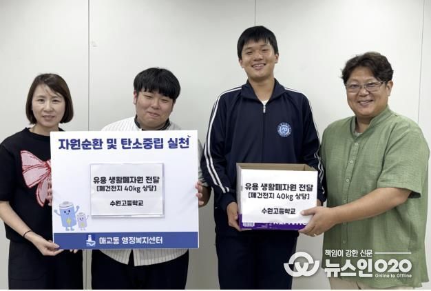 이번 행사는 수원고등학교의 환경 동아리 회원들이 최근 학교에서 폐건전지 수거 캠페인을 진행해 모은 폐건전지 40kg를 매교동 행정복지센터에 전달하기로 결정함에 따른 것이다. 행사에는 수원고등학교 교사 및 학생들이 참석해 그 의미를 더했다.